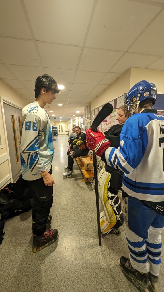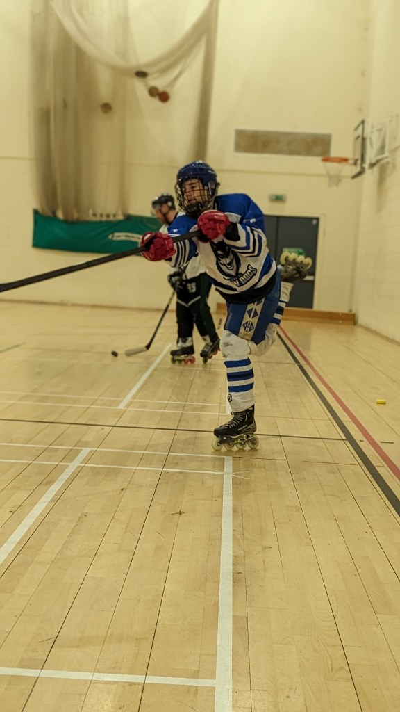 Normally players will get kitted up around 6pm and then your coach will guide you through some basic skating warm ups, then players will do some stretches to make sure our joints are all ready. Next we will spend around half an hour running through some training drills such as passing, shooting, positioning e.t.c. These drills are designed to teach you how to play and give you skills that you can use in games. The last half hour is what we call a scrimmage a.k.a a game. Players will be put into two teams to play a friendly game against each other. It’s a good idea to have a plain white training jersey and a plain black training jersey so you can be easily assigned to a team. Once scrimmage has finished, that’s the end of the session at 7.30pm.
